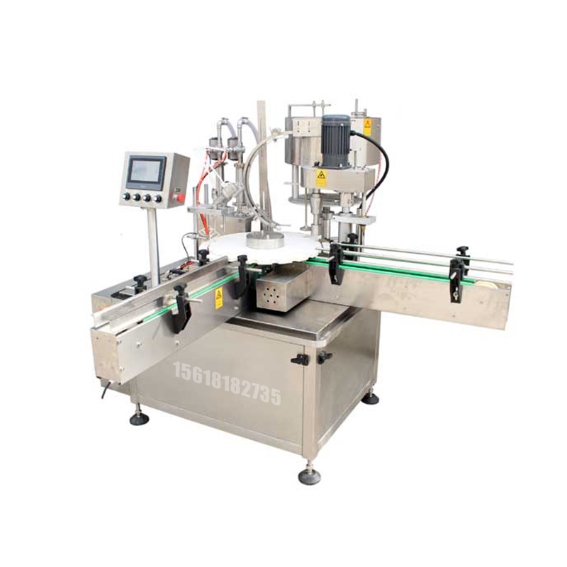 ??該機灌裝部分采用伺服電機驅動、容積式計量充填原理,實現了灌裝劑量的高精度。旋蓋部分由供蓋系統、刮蓋、壓蓋、夾緊、輸瓶和旋蓋等完成自動旋蓋。
